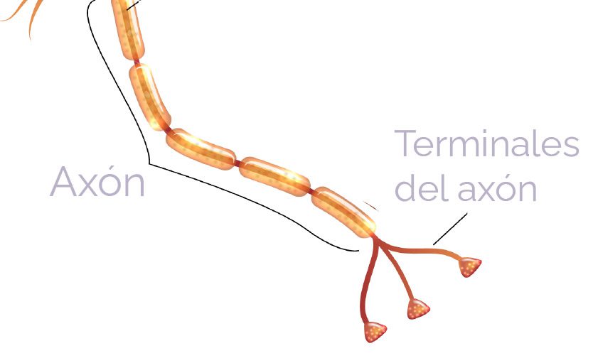 3. El axón: Es un tubo único que nace del cuerpo de la neurona; a diferencia de las dendritas, no acepta información, sino que va encaminado a transmitirla a otras neuronas por medio de los receptores.
