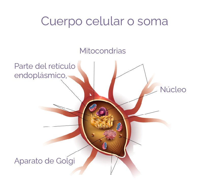 1. El cuerpo celular o soma: Contiene todos los elementos que necesita la neurona para mantenerse viva, entre estos: el núcleo, parte del retículo endoplásmico, el aparato de Golgi y algunas mitocondrias, estos organelos (estructuras subcelulares ) ayudan a la neurona a tener todo lo necesario para poder llevar a cabo su función.
