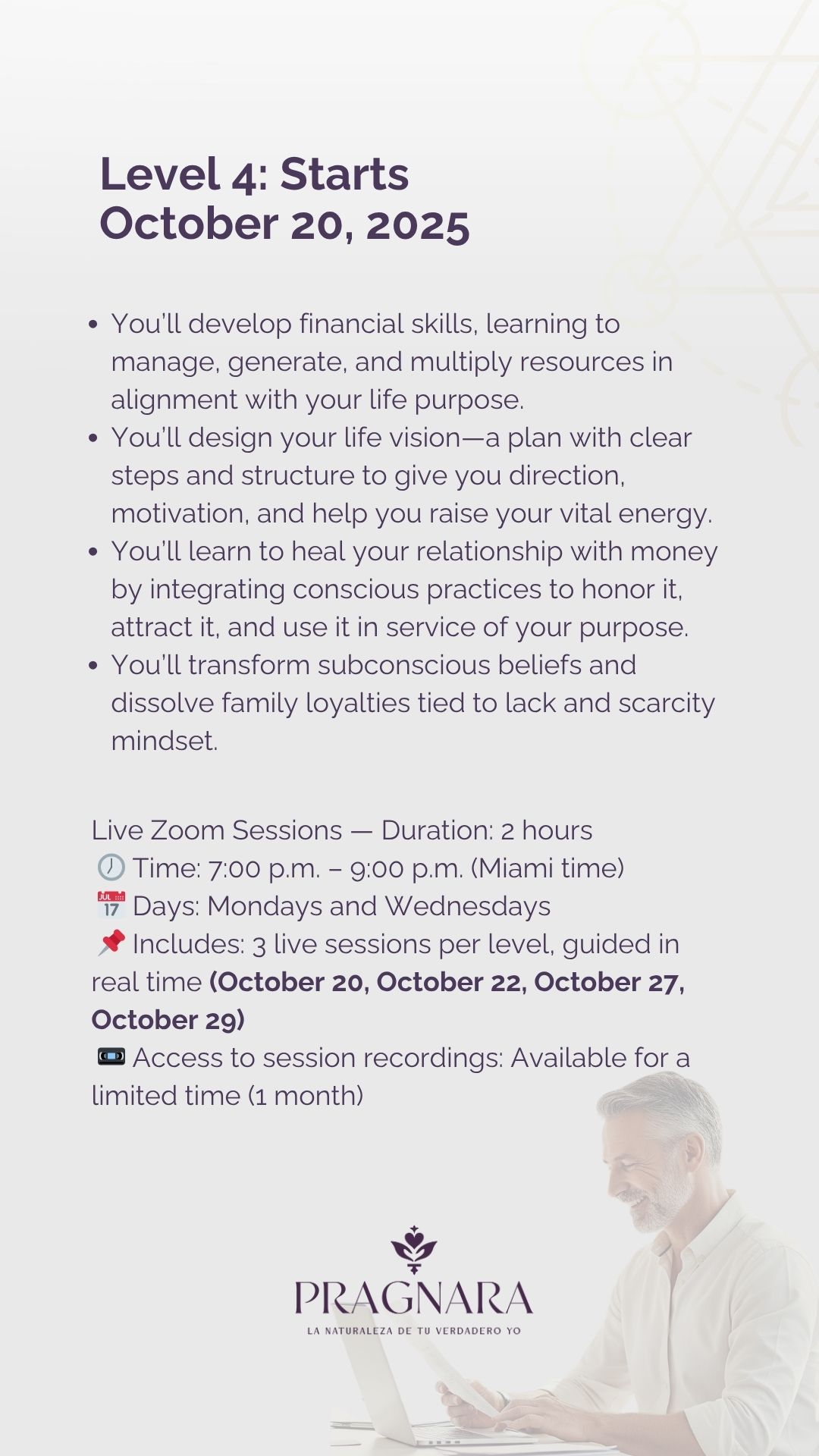 At each level, you’ll receive eBooks, guided meditations, practical exercises, and specially designed audio tracks to help you integrate each lesson into your daily life.