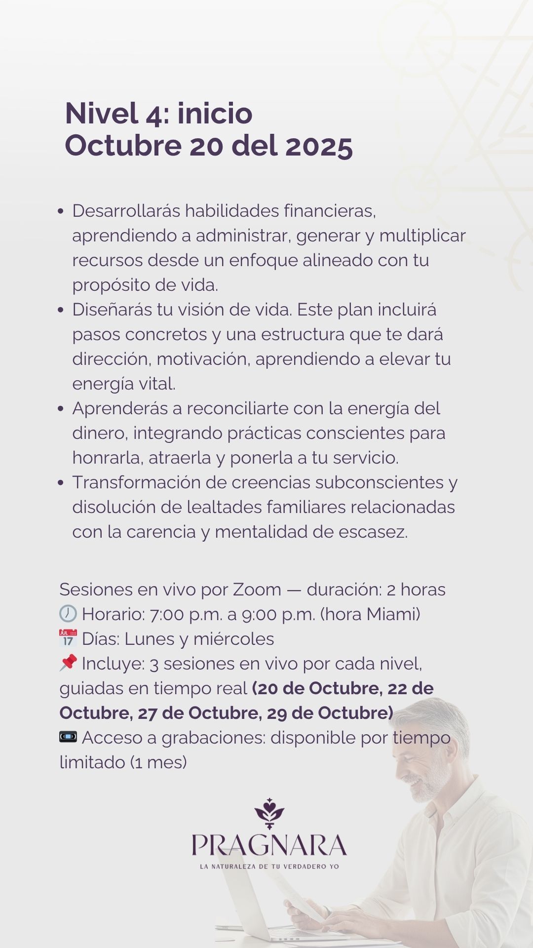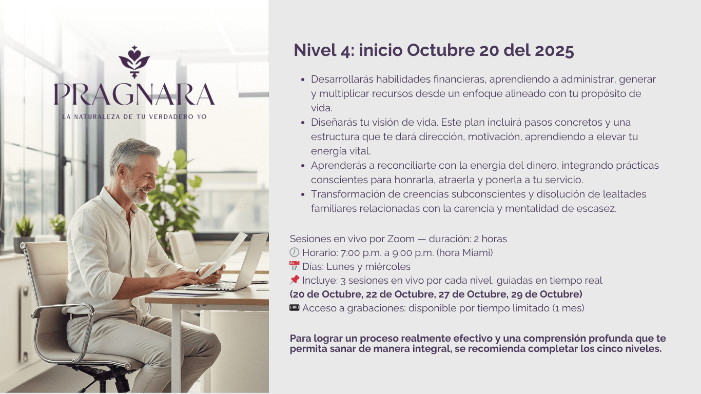 Es tu momento para aprender a vibrar en la frecuencia del dinero y esto solo es posible al conectar profundamente con tu mente subconsciente, desbloqueando patrones limitantes y aplicando las herramientas necesarias para manifestar la prosperidad.